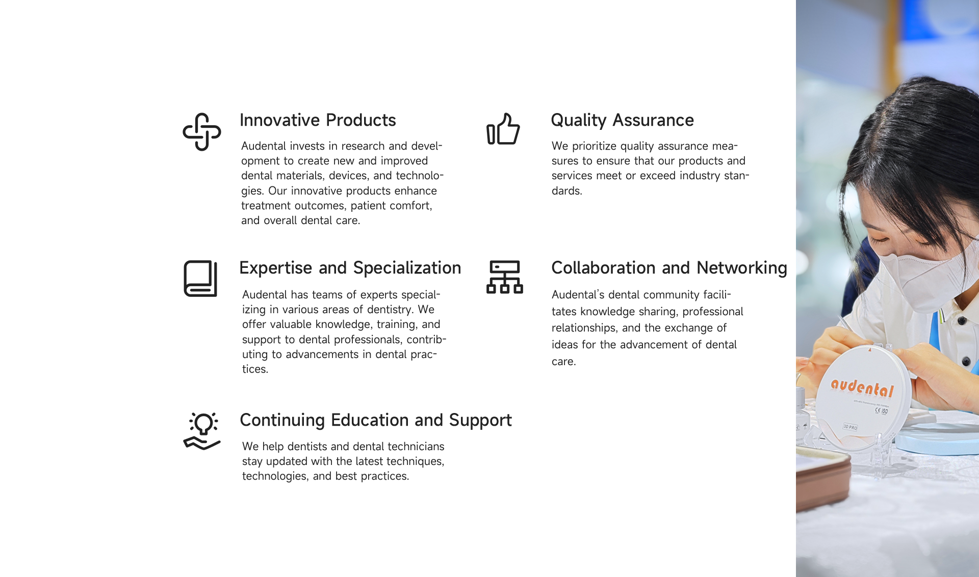 Driven by a dynamic R&D team with deep expertise in materials science, process innovation, and clinical applications, Audental is continuously evolving its technologies and product lines to meet the demands of an ever-changing dental landscape.